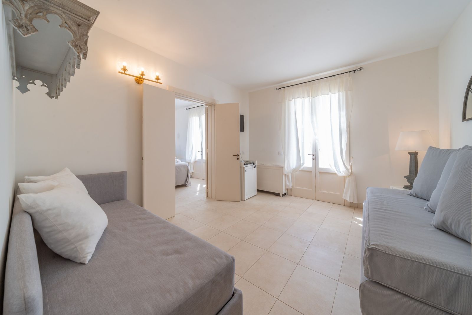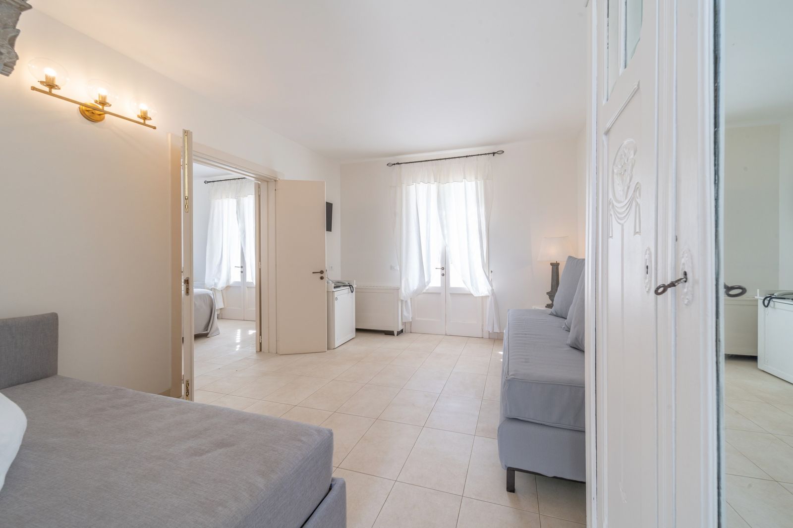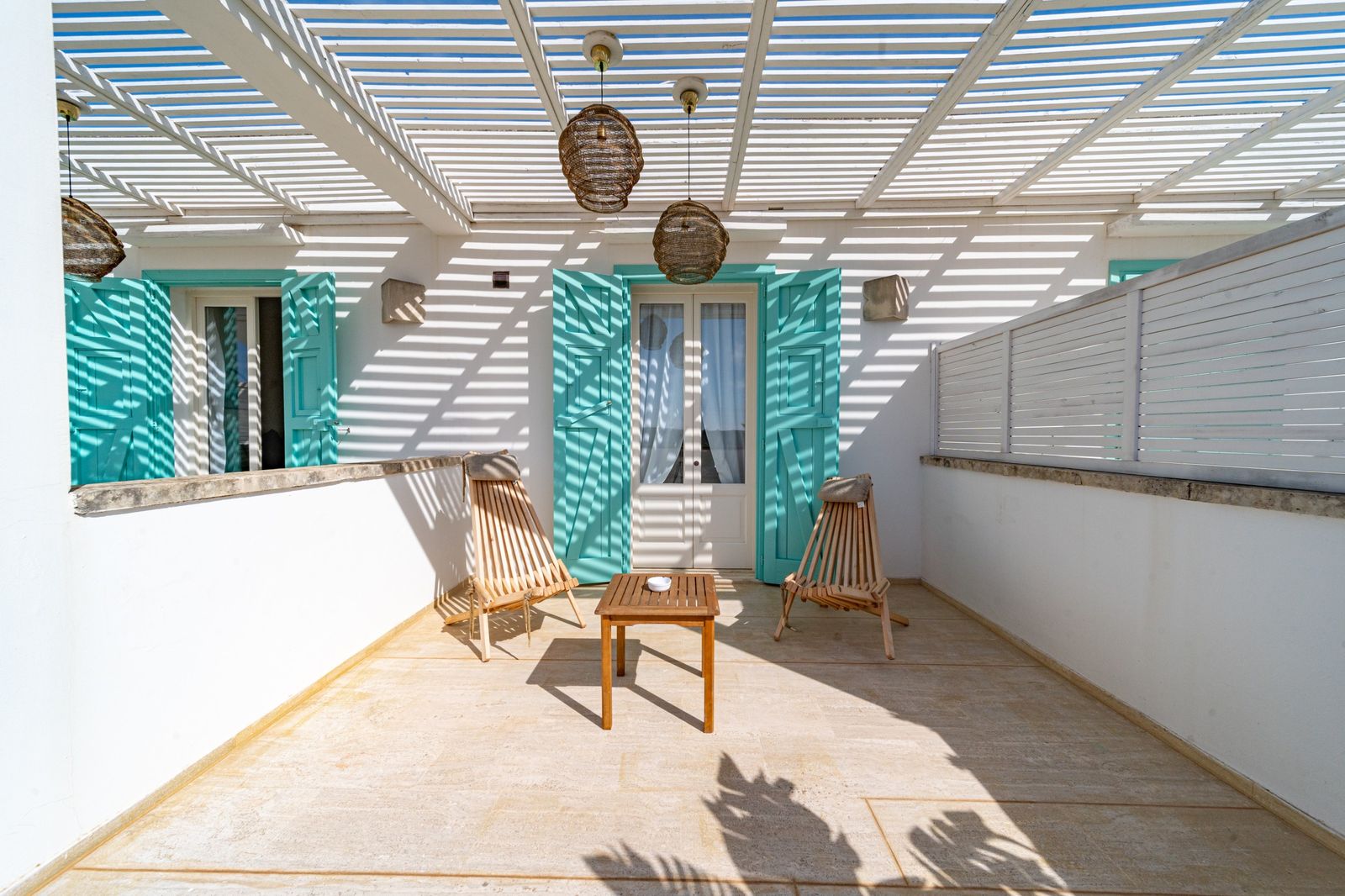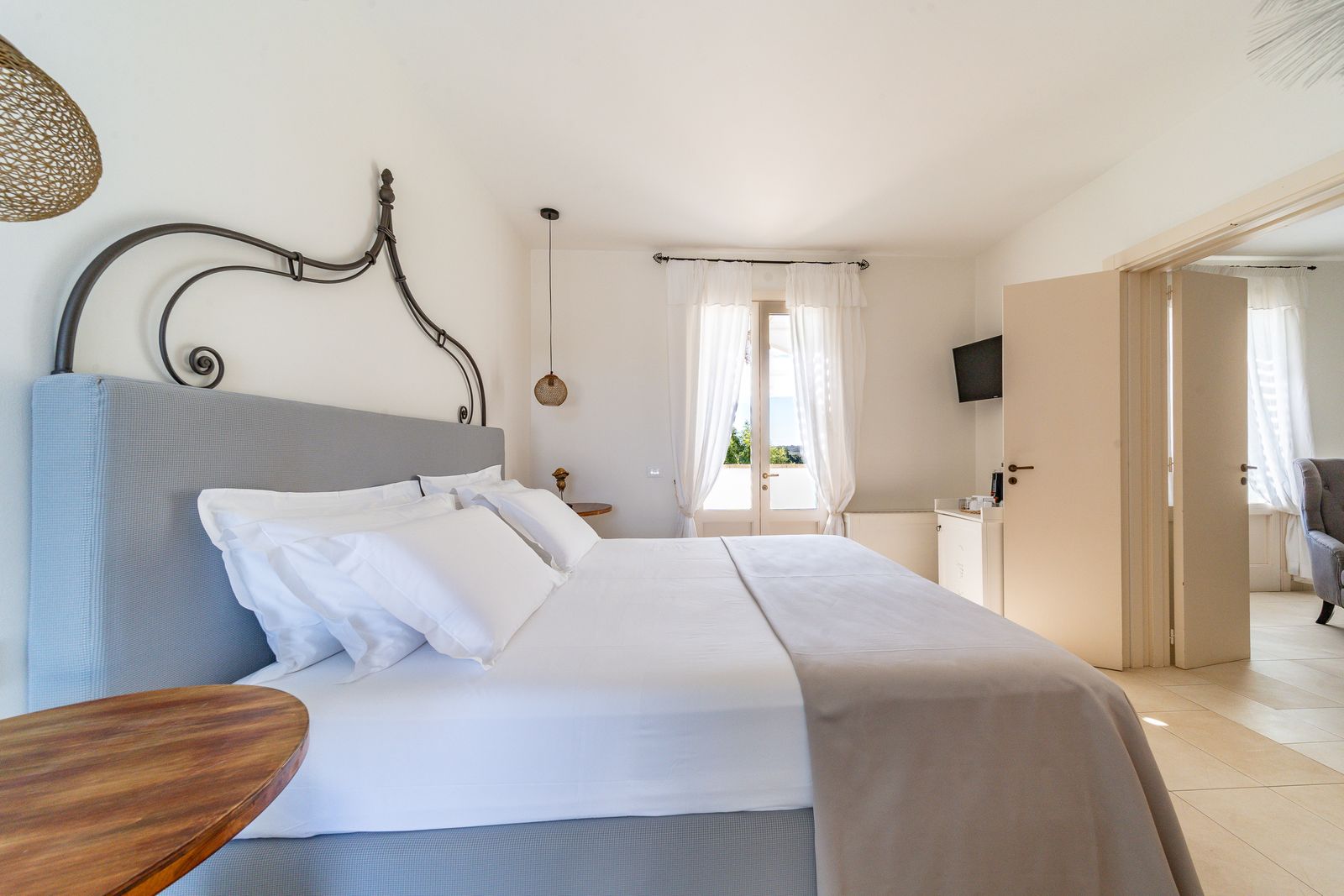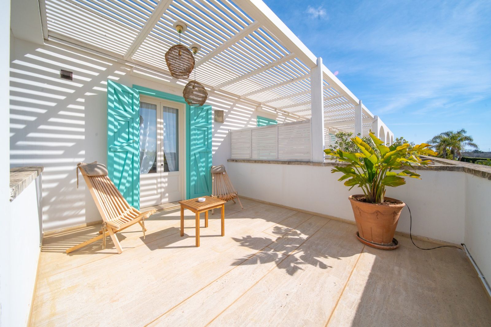 Refined and elegant suite, finely furnished and equipped with every comfort, consisting of two bedrooms, two bathrooms and a large balcony overlooking the garden. The private terrace, surrounded by greenery to guarantee your privacy, is equipped with loungers and an outdoor seating area where you can relax and enjoy the enchanting landscape. This suite is the ideal solution for families or groups of friends.