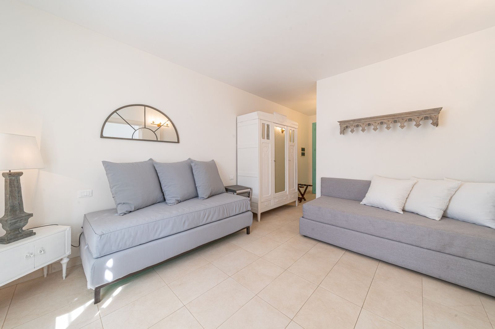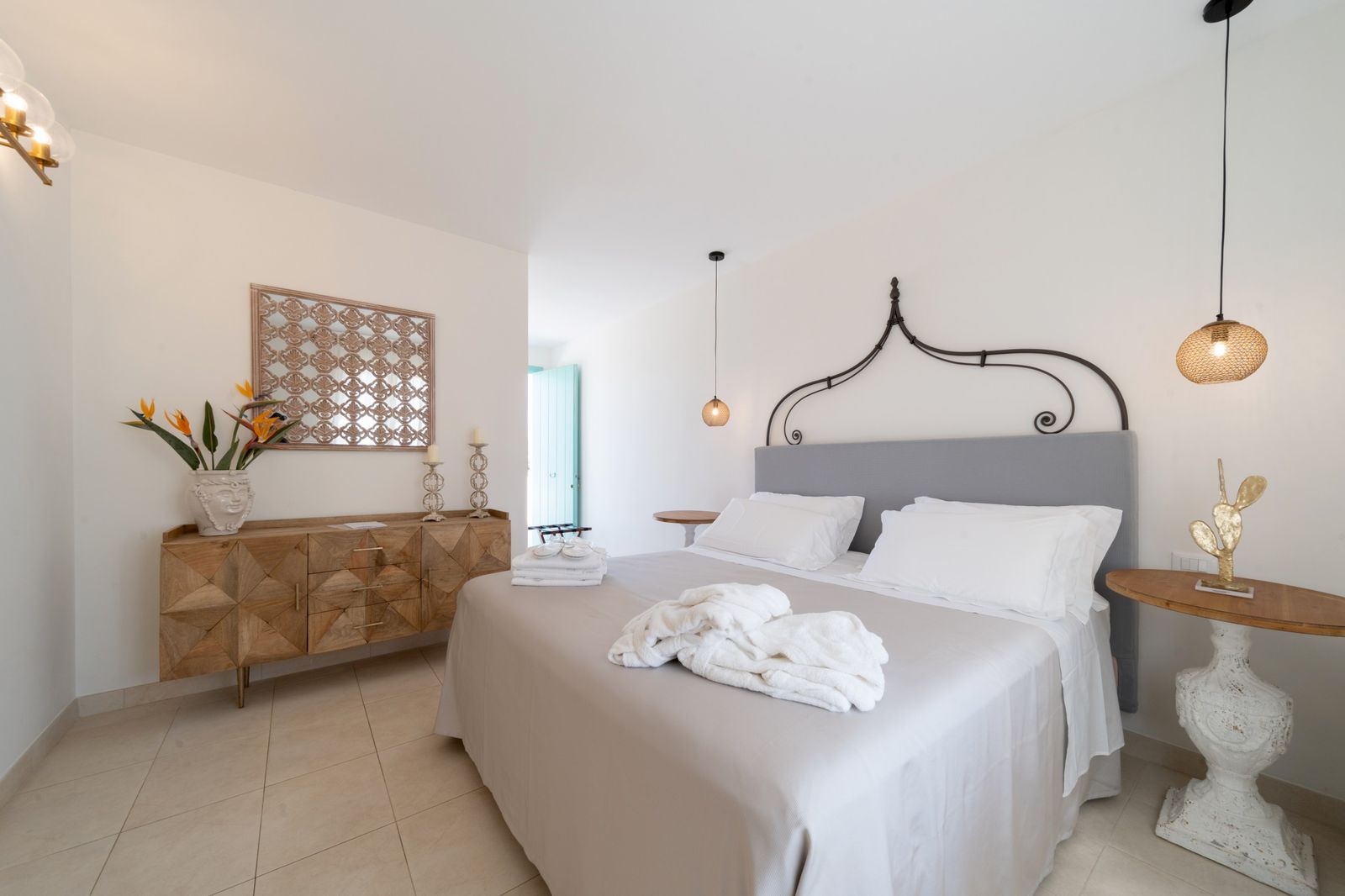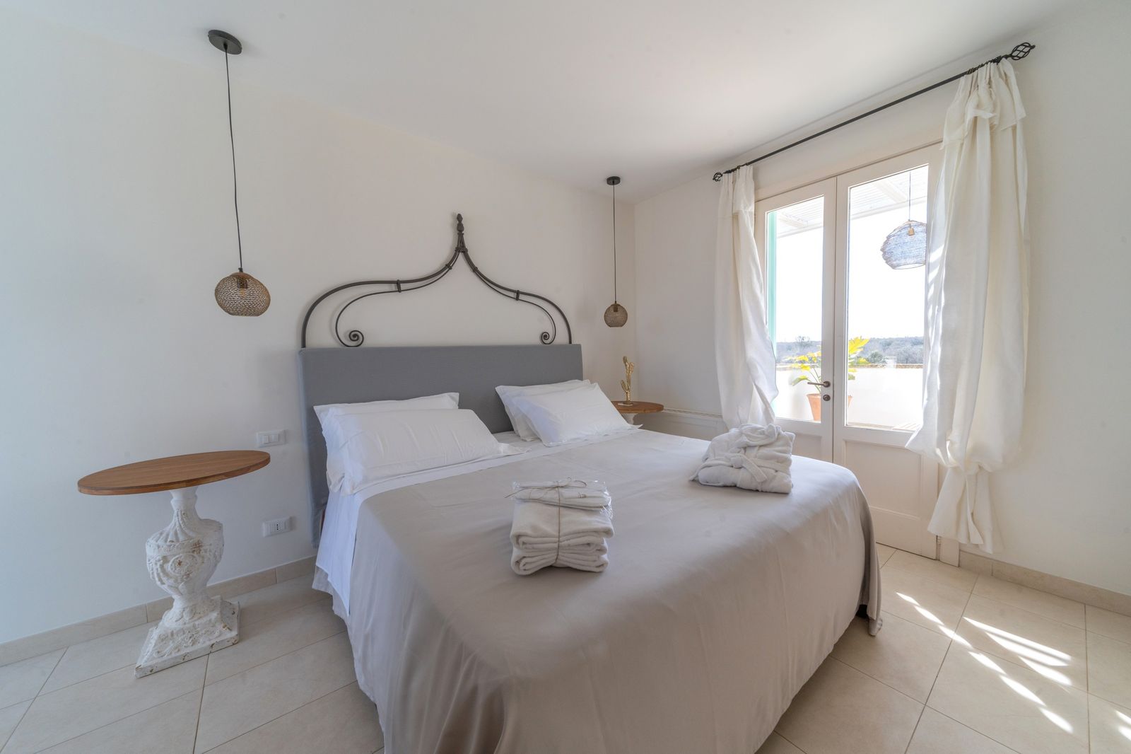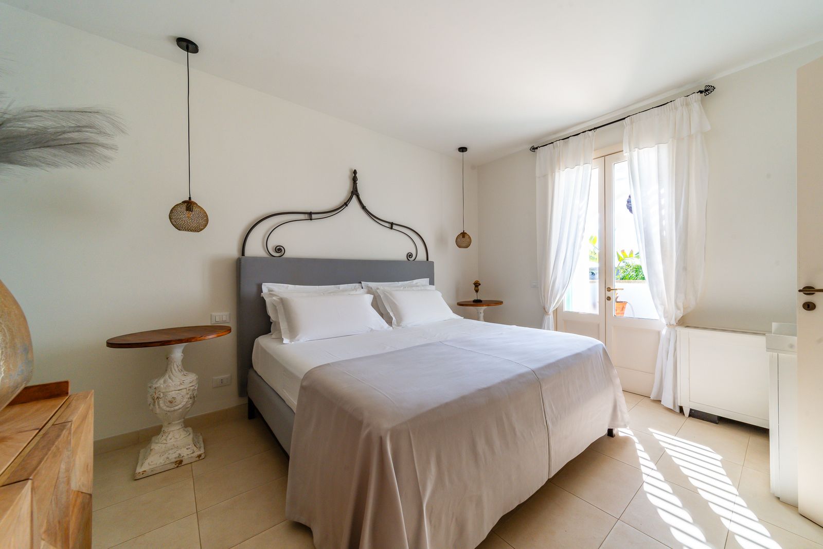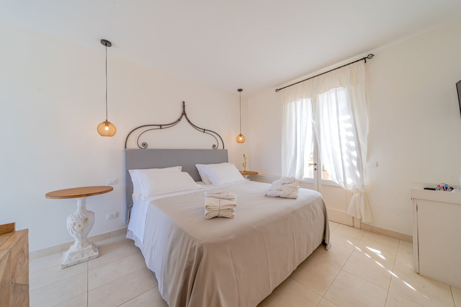 Refined and elegant suite, finely furnished and equipped with every comfort, consisting of two bedrooms, two bathrooms and a large balcony overlooking the garden. The private terrace, surrounded by greenery to guarantee your privacy, is equipped with loungers and an outdoor seating area where you can relax and enjoy the enchanting landscape. This suite is the ideal solution for families or groups of friends.