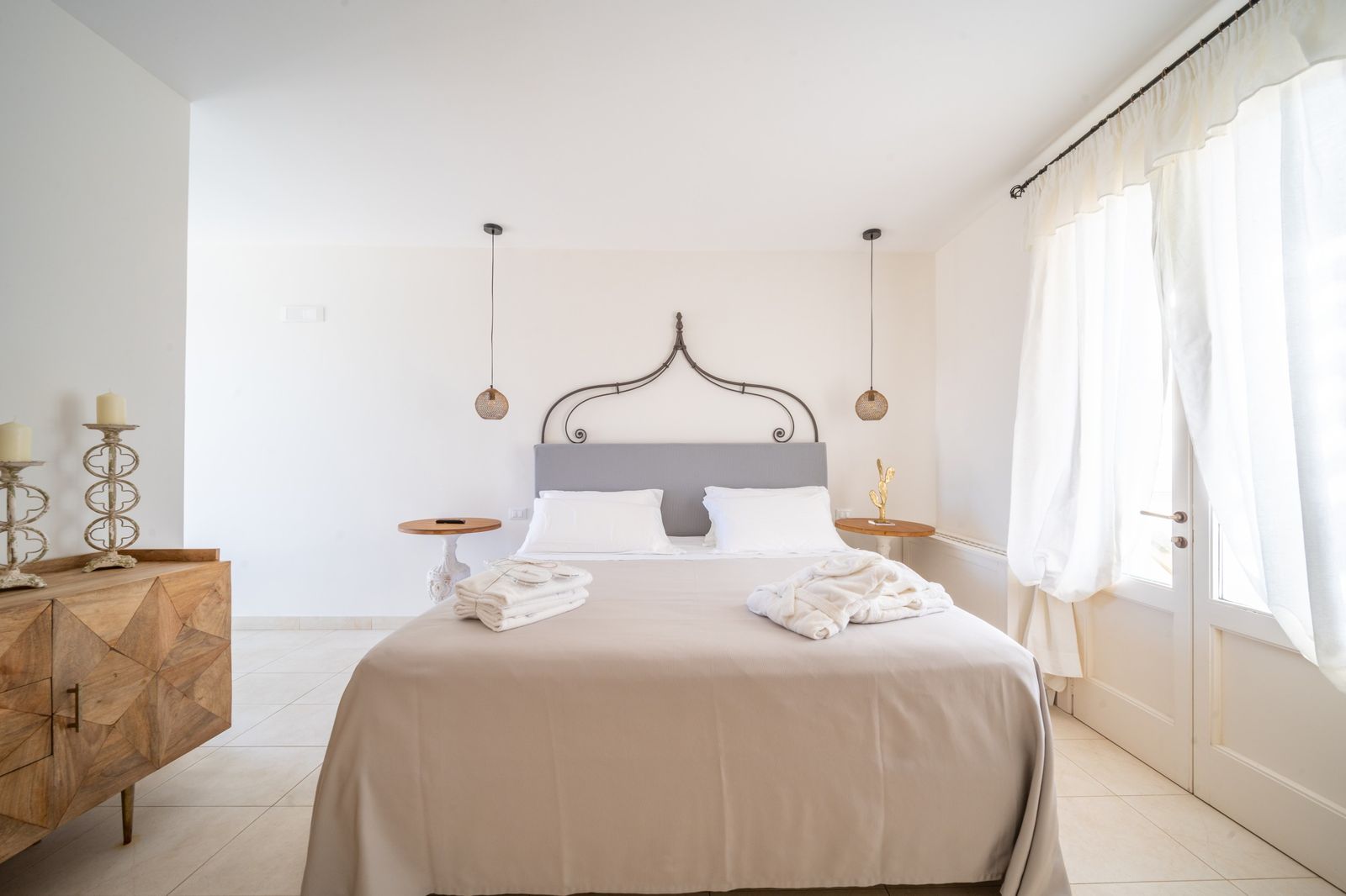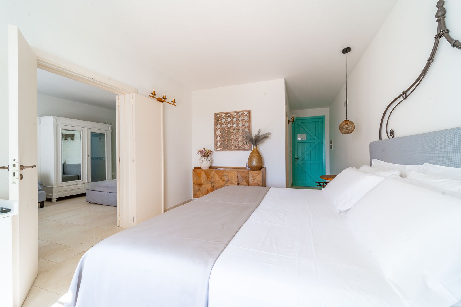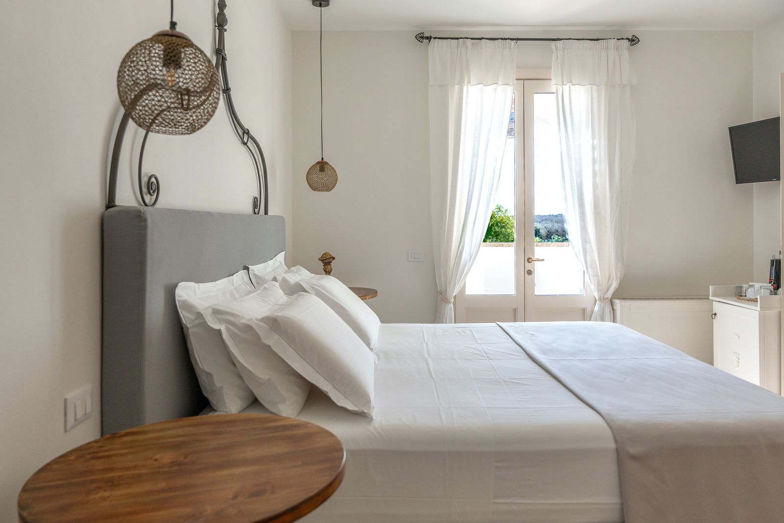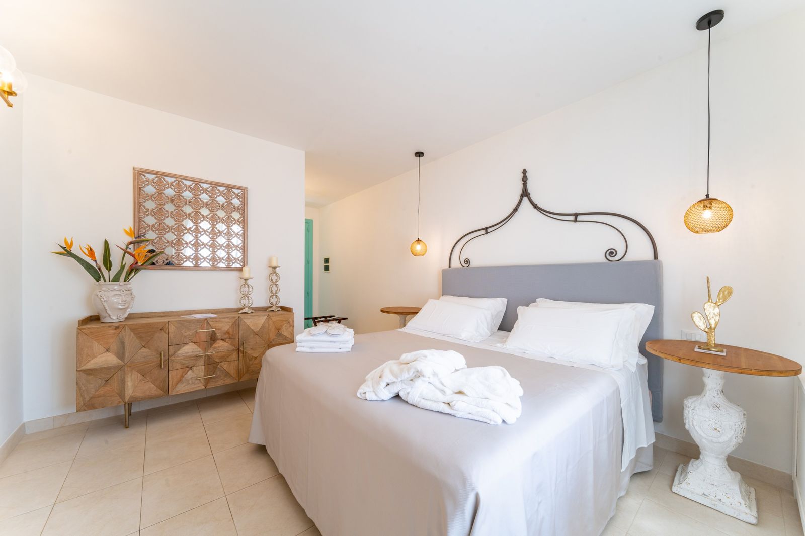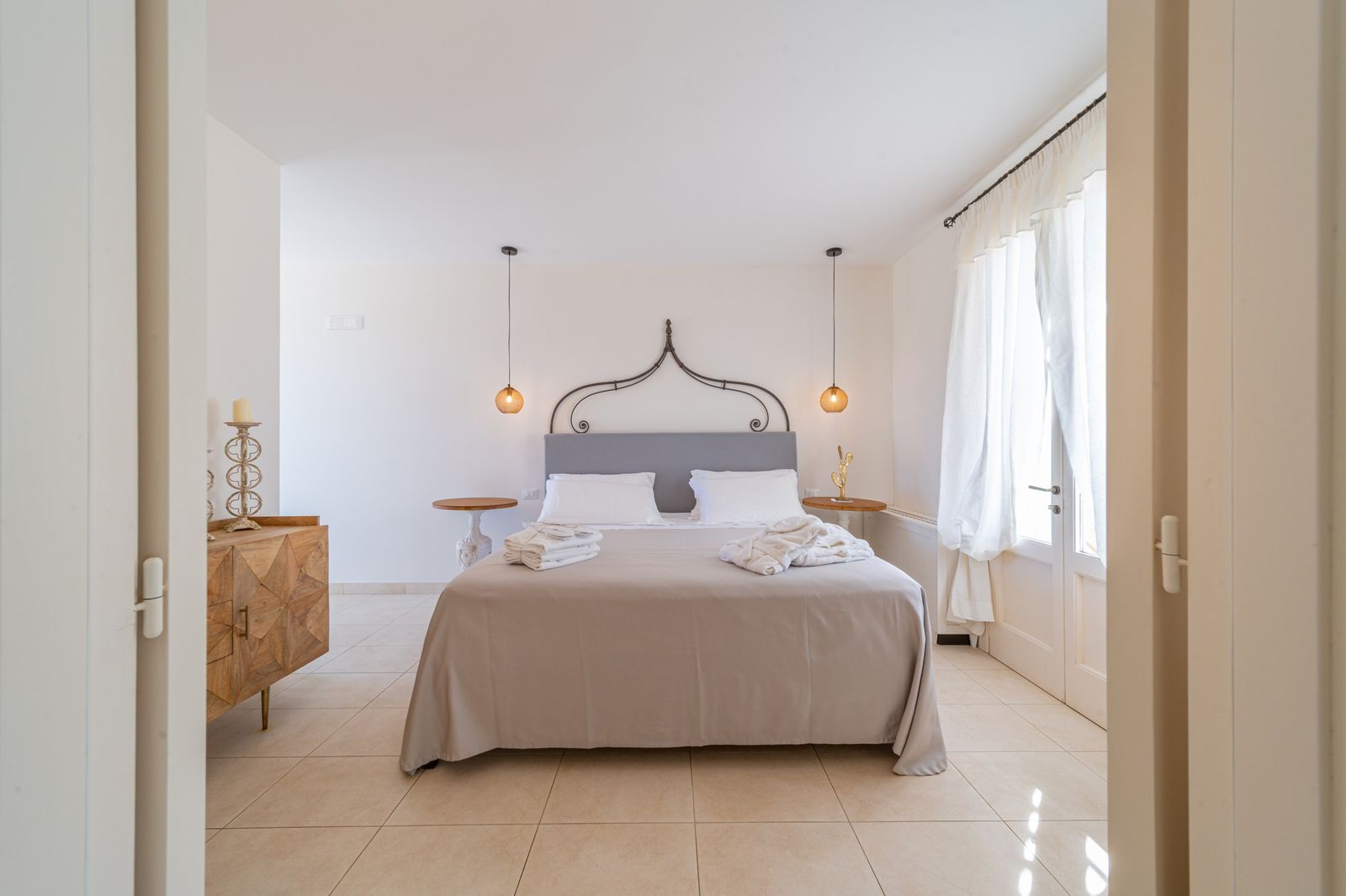 Refined and elegant suite, finely furnished and equipped with every comfort, consisting of two bedrooms, two bathrooms and a large balcony overlooking the garden. The private terrace, surrounded by greenery to guarantee your privacy, is equipped with loungers and an outdoor seating area where you can relax and enjoy the enchanting landscape. This suite is the ideal solution for families or groups of friends.